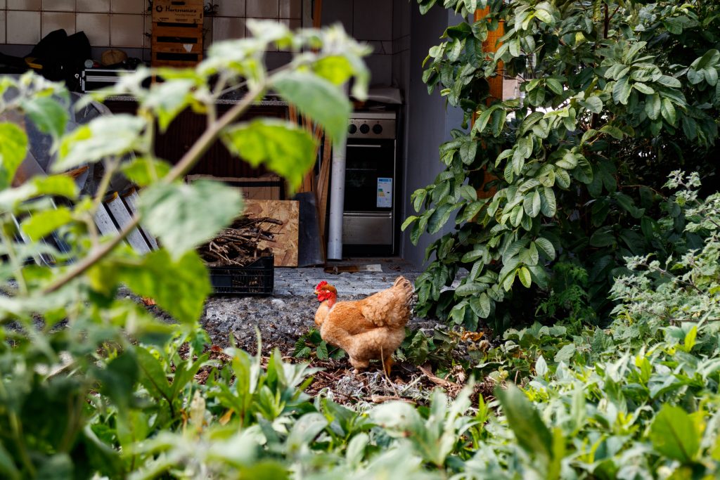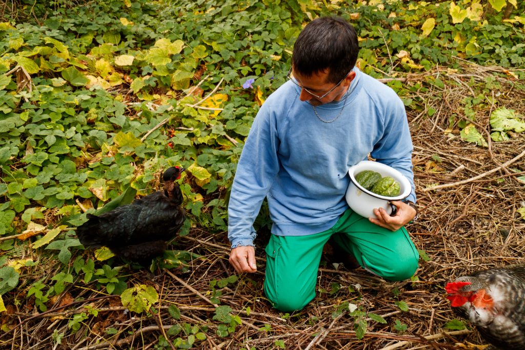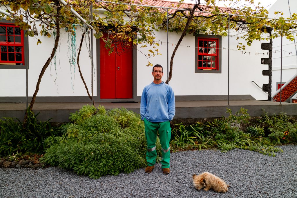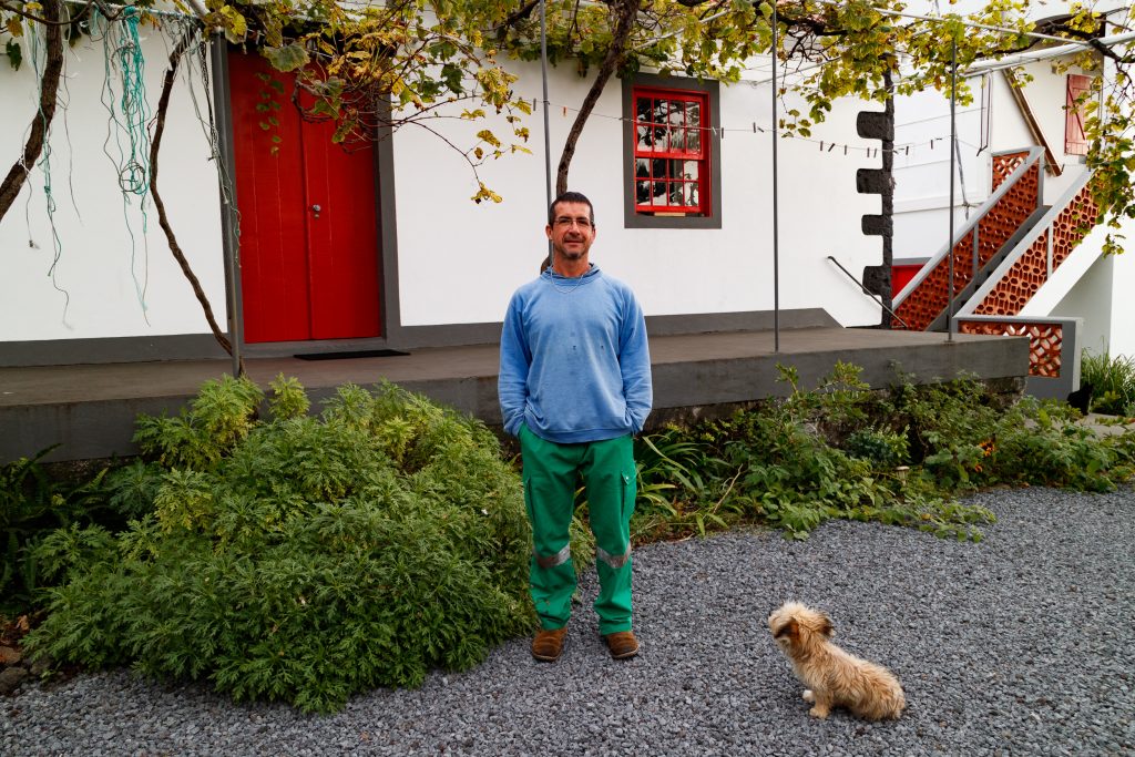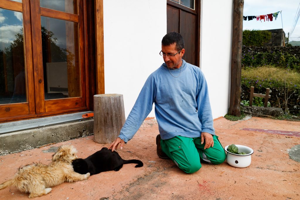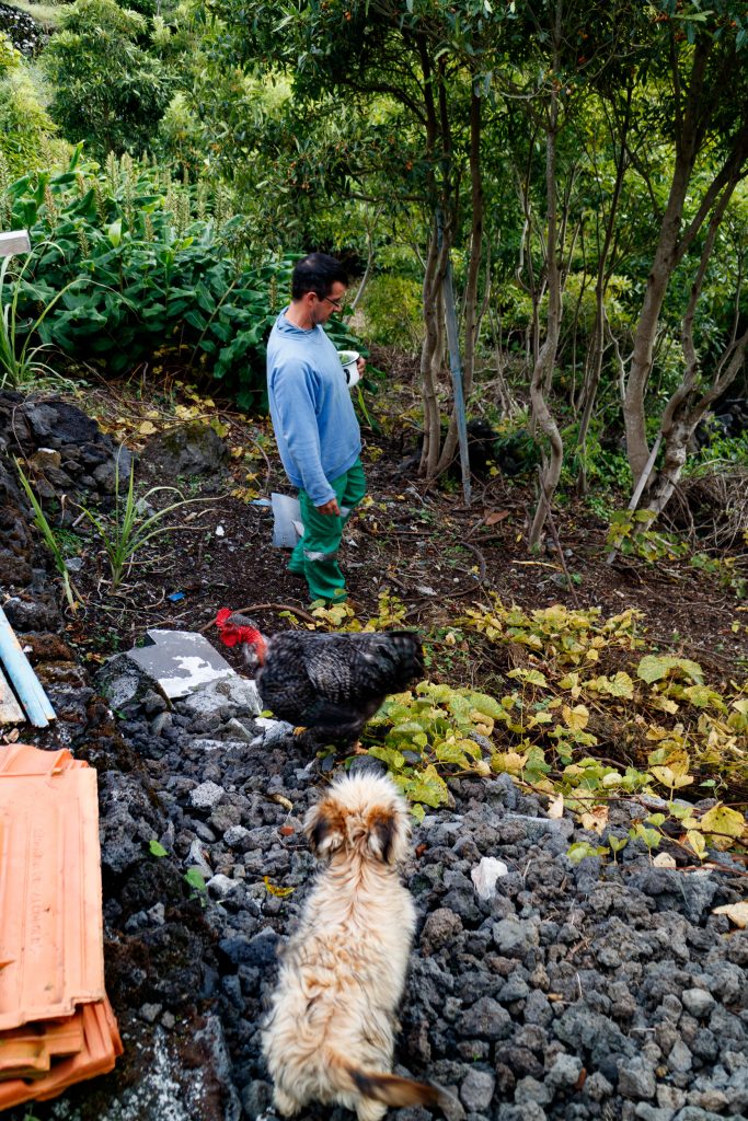 He greets everyone with a smile and if you don’t know that he only arrived to Pico in 2018, you would think he is a local. His french accent gives him away, even tho he speaks portuguese, english, german and russian fluently. His skin is always tanned from the work outside and his little puppy Pollux, the black cat Phébus und his chickens and ducks are always somewhere around, following him throughout his vast land.